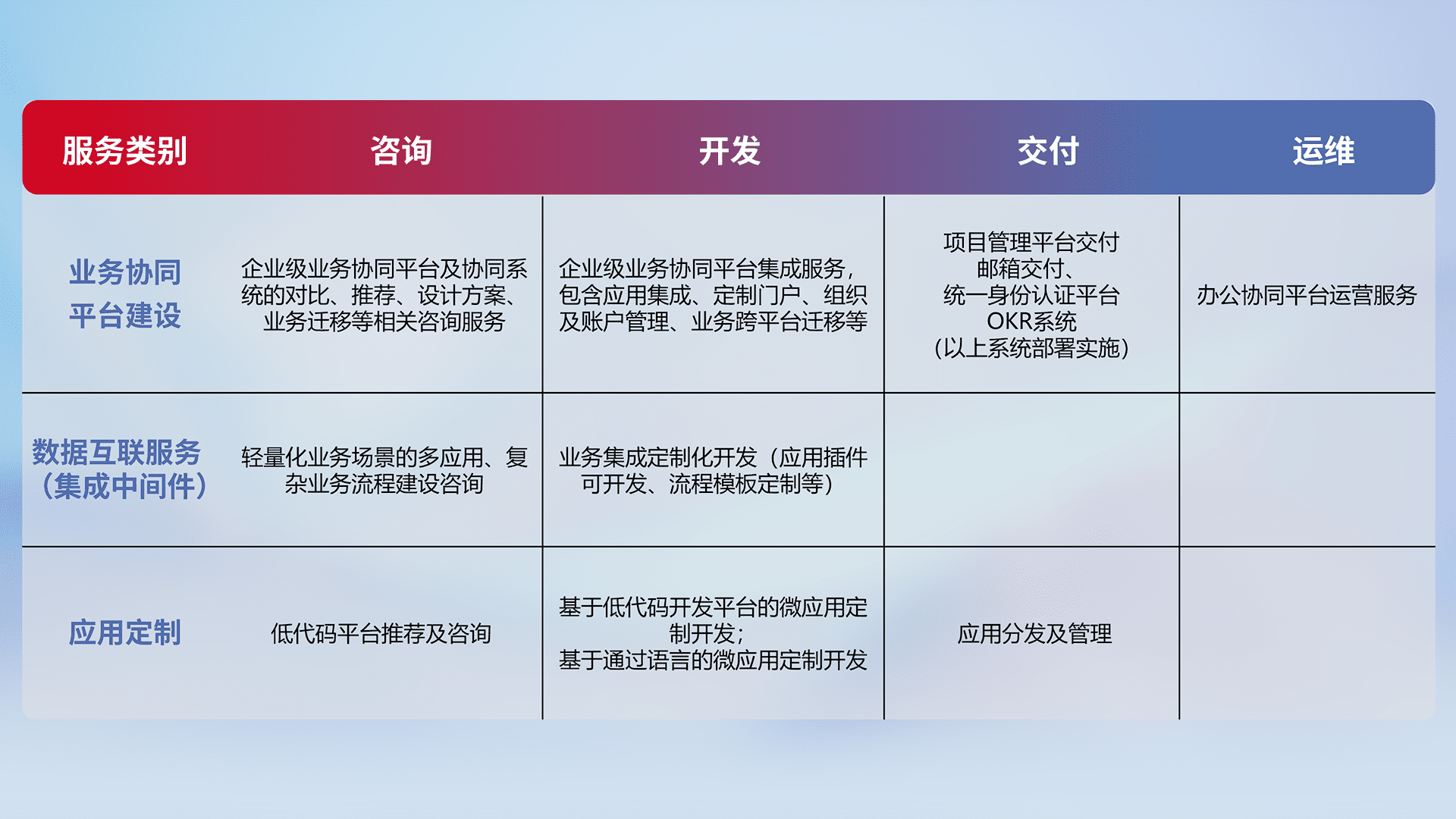 针对钉钉、、、企微、、、IDaas等平台级产品提供产品的规划、、、、方案、、交付、、定制化开发等服务,,实现如统一协同办公、、、、智能客户服务、、、、混合会议管理、、、智能数据查询、、、等业务场景,,实现数字化转型。。。。